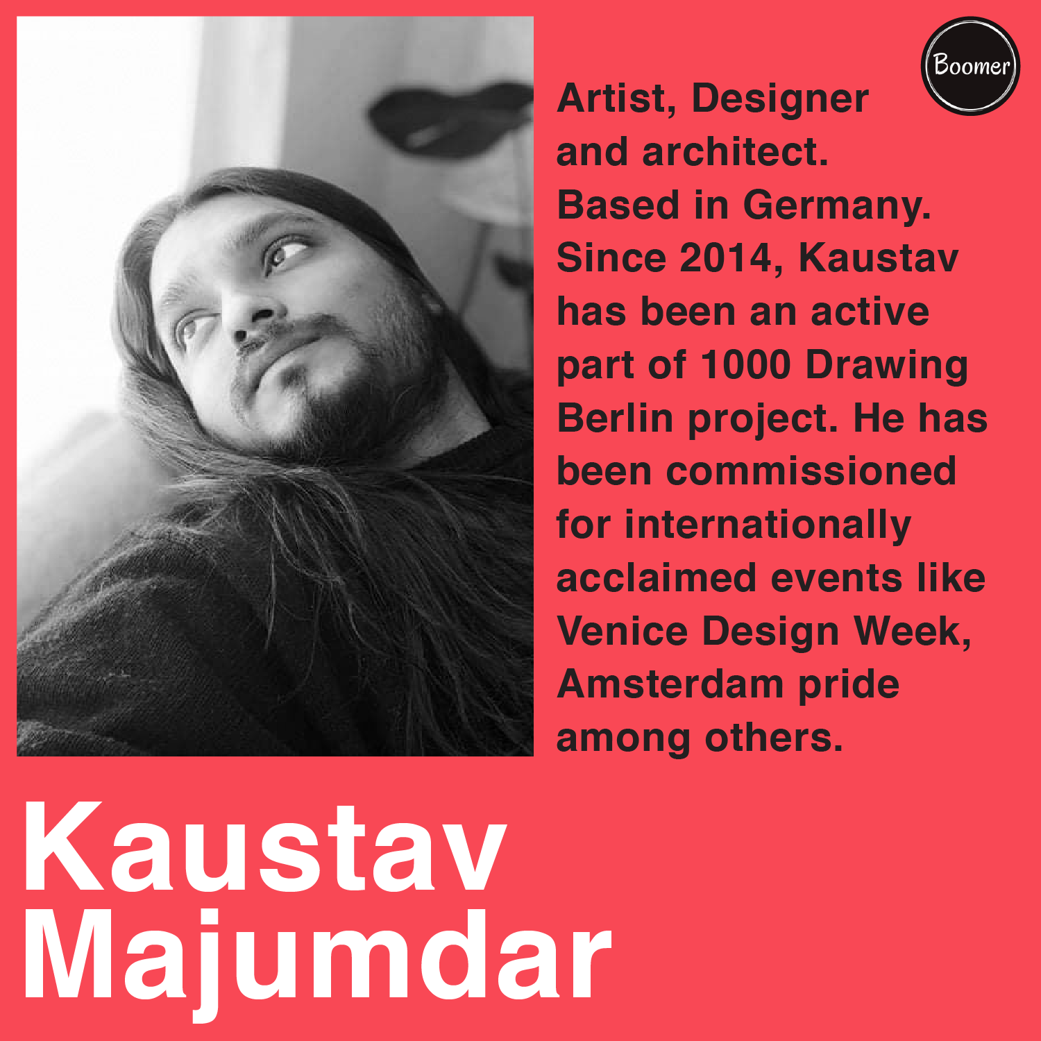 Kou/ Kaustav Majumdar (* 1987) is a contemporary artist and scenographer. His work appears regularly at different creative and entertainment events in Berlin and Freiburg. Kaustav Majumdar’s art has been subject to numerous pop-up exhibitions in Germany. He has drawn live from the Wurzel Festival, and Venice Design Week, and he has sketched recently Berlin City — while the city was highly under construction. He created The Freiburgs’s first Live Digital Art Mixing as well as hand-drawn city visuals for the Cafe Ruef. Clients include Electric Monday, Many well-known DJs around Germany, and Private art collectors.